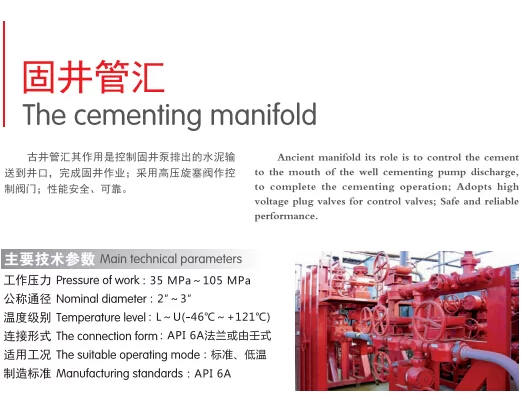 Antik manifoldun rolü, çimentolama işlemini tamamlamak için kuyunun ağzına kadar çimentolama pompasının boşaltılmasını kontrol etmektir; Kontrol vanaları için yüksek voltajlı plug vanaları kullanır; Güvenli ve güvenilir!